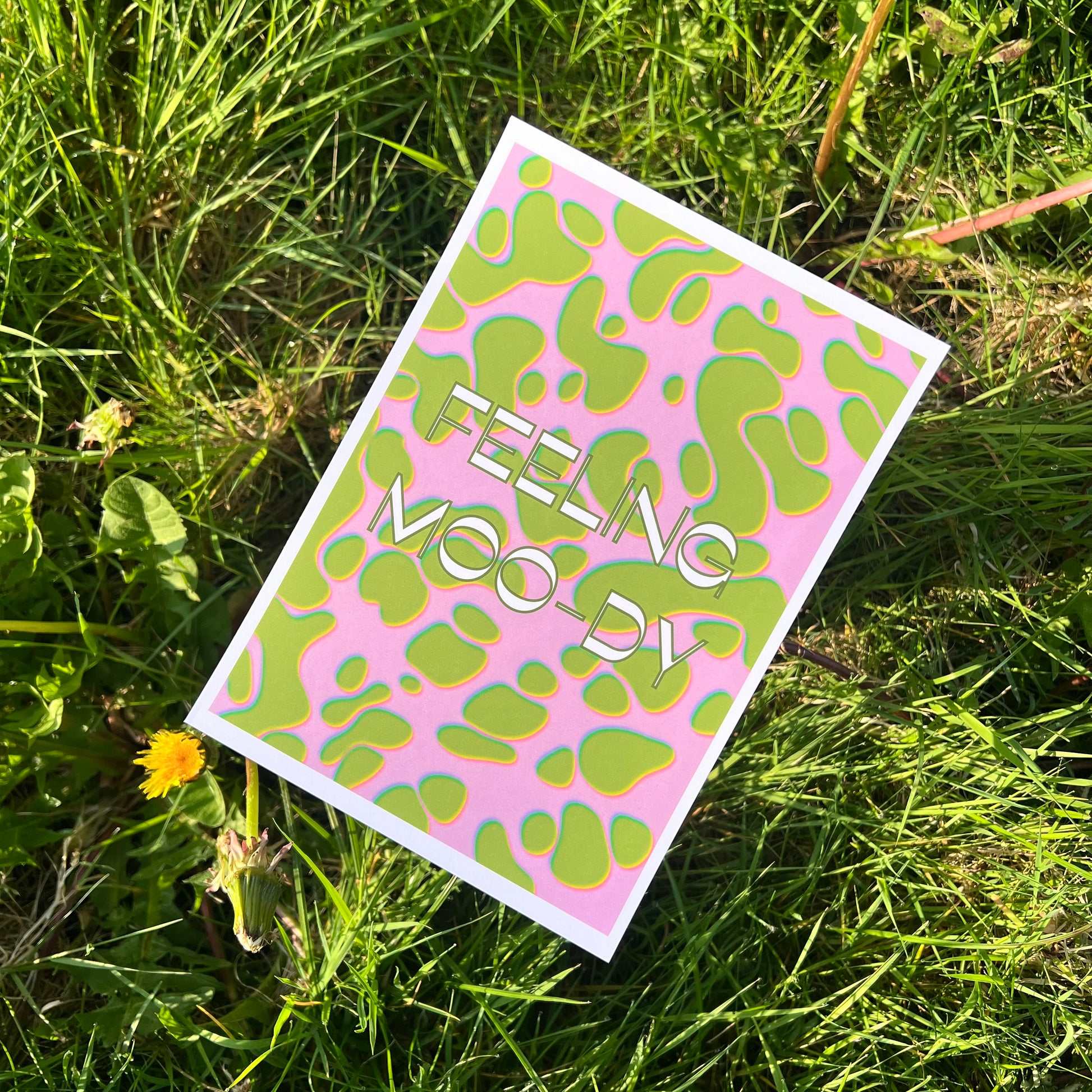Serve up sass and surrealism with the Feeling Moo-dy poster—a bold, playful twist on classic cow print with a dreamy, wavy edge. Featuring olive green spots on a pink background and a cheeky pun front and center, this design is perfect for mooo-d swings, funky walls, or anyone who embraces their inner chaos cow. Printed on high-quality FSC-certified paper in two sizes (15x20 cm and 20x30 cm), and designed by Canyon Moon Design, a small woman-owned business based in the Netherlands.